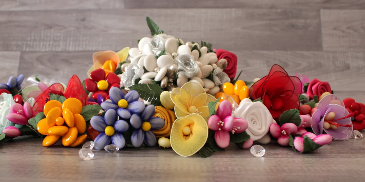 Kvety z mandlí a čokolády sú ručne viazané z talianskych cukríkov (confetti), ktoré majú vo vnútri tie najsladšie mandle na svete (slávnej sicílskej mandle Avola) alebo vyhlásenú belgickú čokoládu. Všetko je ukryté pod vrstvou bielej cukrovej polevy s vanilkou a zvonku obalené farebnými celofánmi alebo tylom.
