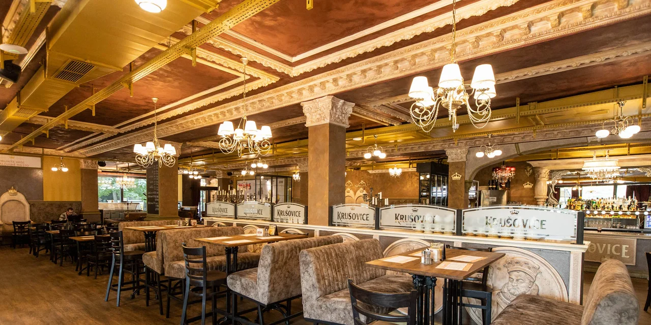 Keď vstúpite dnu, očarí vás kráľovským štýlom Krušovickej pivárne. Pre pivárov ponúka celé portfólio špeciálov priamo z Kráľovského pivovaru Krušovice. Zákazníkom je v reštaurácii k dispozícii do 200 miest. V letných mesiacoch je otvorená terasa s kapacitou do 180 miest.
