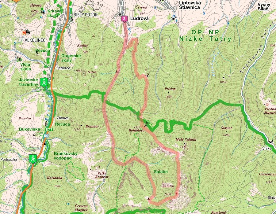Po zhruba štyroch hodinách mierneho stúpania dosiahnete vrchol Salatína (1630 m n.m.). Samotný výhľad zo Salatína nie je ničím úchvatný, pretože vrchol je ešte v pásme kosodreviny. Na panoramatické výhľady bohatý je však zostup na Bohúňovo s pohľadom na samotný Salatín a tiež nádherným výhľadom na Liptov doplneným skalnými útvarmi. Nazad sa vraciate po inej trase vedenej zelenou značkou, ale túru ukončíte na rovnakom mieste ako ste začali.