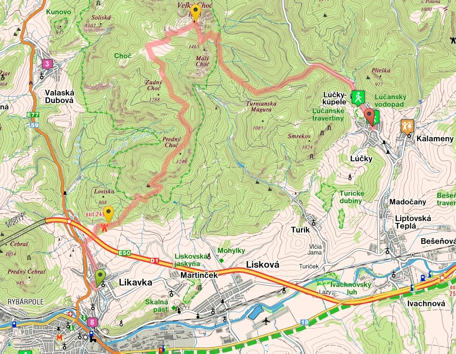 Túra sa dá začať aj v Likavke, rázovitej obci pri Ružomberku. Táto trasa po je jedinečná aj tým, že prechádza po červenej značke popri Likavskom hrade, historickej pamiatke, ktorá určite stojí za návštevu. Trasa je pomerne členitá, postupuje cez horské cesty a lúky. Na križovatke Stredná poľana s trasou z Valaskej Dubovej sa nachádza nocľaháreň „Hotel Choč“. Najnáročnejšie je záverečné stúpanie z križovatky po zelenej značke na samotný vrchol Veľkého Choča (1611 m n.m.). Zostup z vrcholu smerom do lokality Žimerová je miestami ešte strmší a taktiež pomerne náročný. V obci Lúčky na konci trasy sa nachádzajú známe Kúpele Lúčky, AQUA-VITAL Park s termálnou vodou a wellness centrom, kde môžete po náročnej túre zrelaxovať, no tiež atraktívny Lúčanský vodopád.