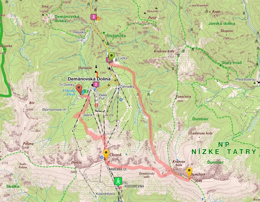 Odporúčame trasu po zelenej značke z Lúčok cez Širokú dolinu a Krúpove sedlo až na Ďumbier (2043 m n.m.) s návratom po červenej značke vedenej po hrebeni cez Demänovské sedlo na Chopok (2024 m n.m.) a následne po modrej značke dole cez Lukovú až na Mikulášsku chatu. Oddýchnuť a načerpať nové sily môžete na Kamennej chate pod Chopkom alebo v Reštaurácii Rotunda, ktoré sa nachádzajú zhruba v polovici trasy. Zostup z Chopku si môžeme skrátiť jazdou na lanovke v rámci strediska Jasná. V tejto oblasti sa nachádza aj autobusová zastávka, z ktorej sa odveziete späť na parkovisko na Lúčky alebo priamo do Liptovského Mikuláša.