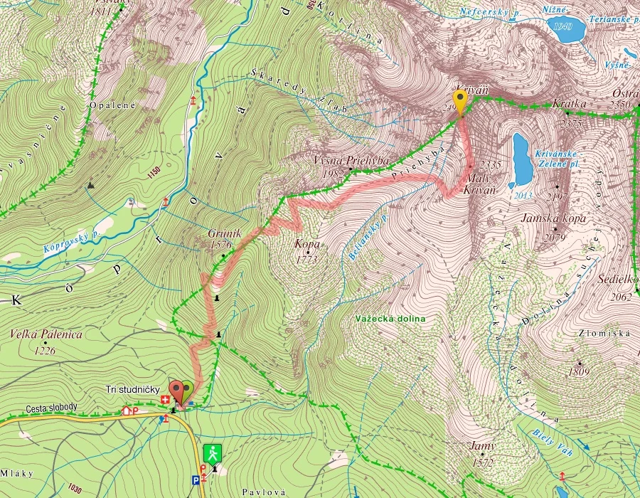 Začínate na Troch studničkách, mieste dostupnom z hlavnej cesty smerujúcej z osady Podbanské do Vysokých Tatier, kde sa dá aj bezplatne zaparkovať. Trasa pokračuje kosodrevinou, pričom výstup dopĺňajú atraktívne výhľady na celý región. Až po Krivánsky žľab je trasa pomerne nenáročná a značená zelenou značkou. Od tohto miesta sa náročnosť stupňuje, aj kvôli skalnému terénu. Ďalej treba postupovať po modrej značke. Záverečný výhľad, no hlavne pocit, že ste na vrchole Kriváňa (2494 m.n.m.), rozhodne stojí zato. Pre náročnejších turistov je možné trasu späť doplniť o návštevu Jámskeho plesa a až následne sa vrátiť na Tri studničky po červenej značke cez bývalú Važeckú chatu. Túra sa však predĺži o 4 kilometre a necelú hodinu chôdze.