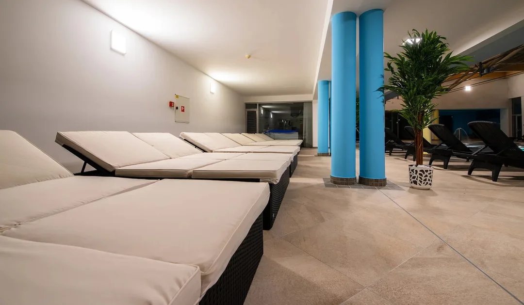 - vnútorný relaxačný bazén s hydromasážnymi prvkami a teplotou vody 28–30 °C