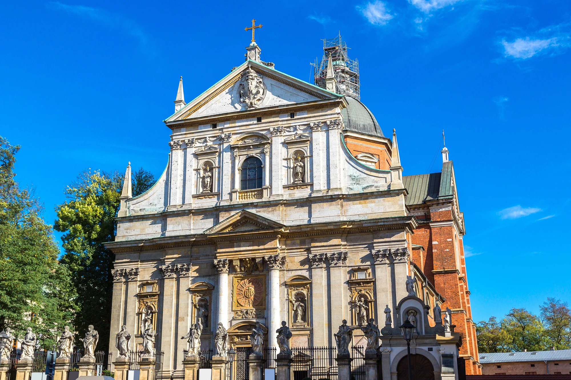 2 dni Rímskokatolícky kostol postavený na začiatku 17. storočia. Pre Spoločnosť Ježišovu ho dal postaviť poľský kráľ Žigmund III. Vasa a ide o vôbec prvú barokovú stavbu v Krakove. Pohľady zvedavcov láka predovšetkým dolomitové priečelie so sochami jezuitských svätcov. Interiér charakterizuje štuková výzdoba a výjavy zo života svätých Petra a Pavla a neskorobarokový oltár so sochami od Antonia Fraczkiewicza a Jozefa Brodowského. Nájdete ho na ulici Grodzka, hneď vedľa kostola sv. Ondreja a na polceste medzi hlavným trhovým námestím v Krakove a hradom Wawel.