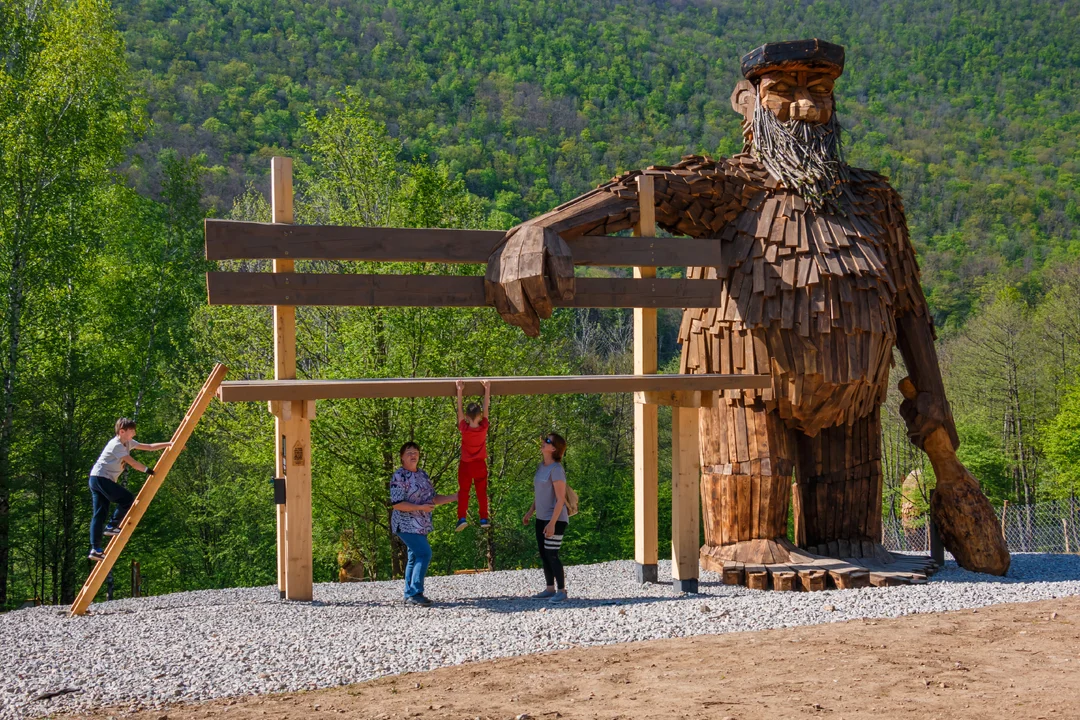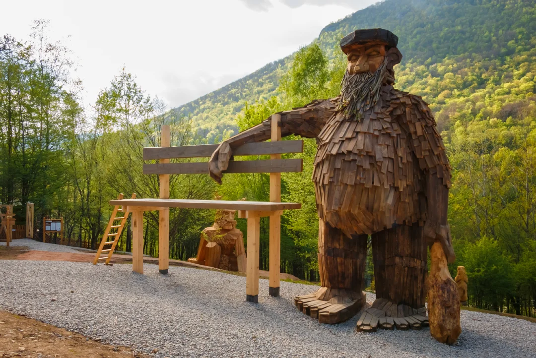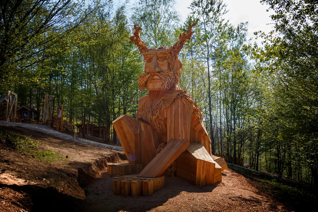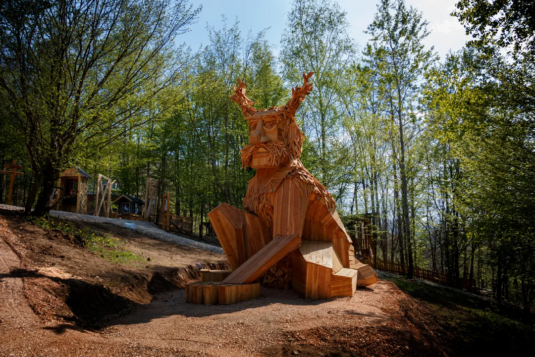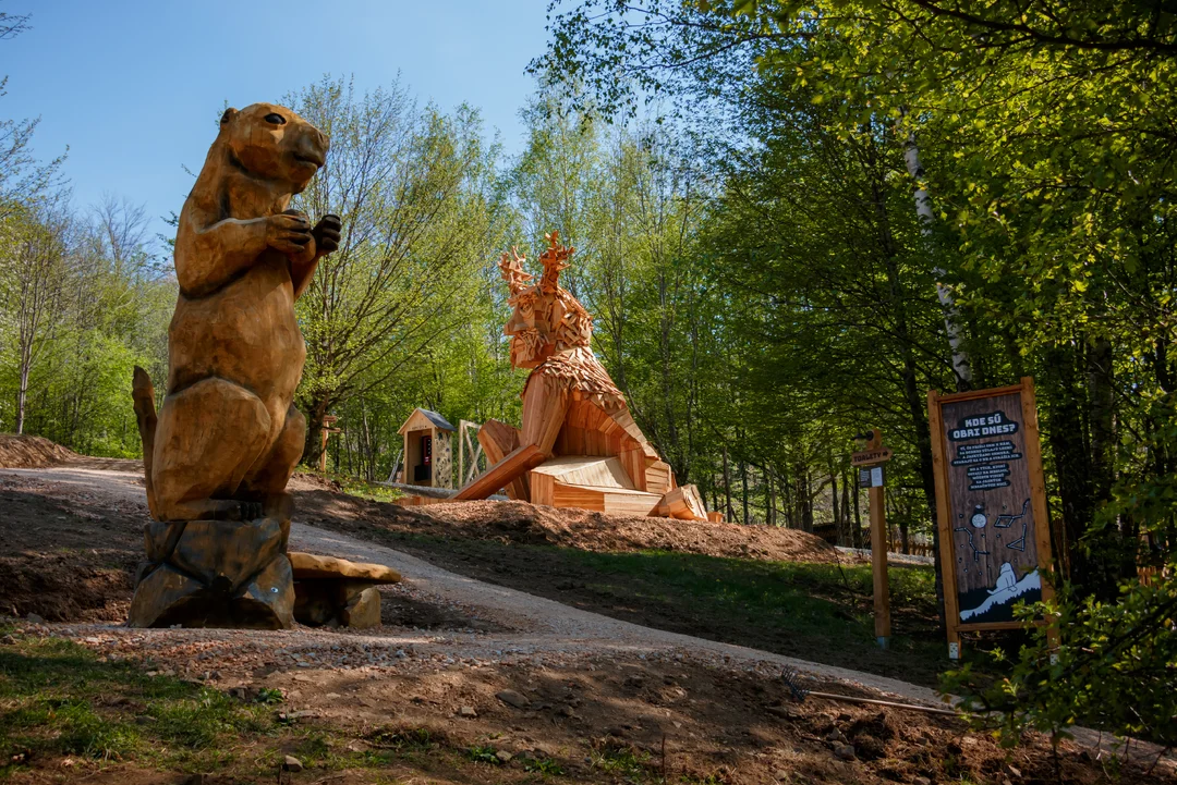 Obrovské sochy vo výške 7 až 9 metrov vyrobili majstri rezbári z Česka, niektoré vážia až 5 ton. Nájdete tu obrov menom Leši, Machoš, Bažur, obriu sovu Széchy a ďalších drevených sympaťákov. Inšpiráciou pre vznik parku bola najmä tajuplná slovanská mytológia a tiež vedecko-fantastická kniha miestneho rodáka Gustáva Reussa Hviezdoveda.