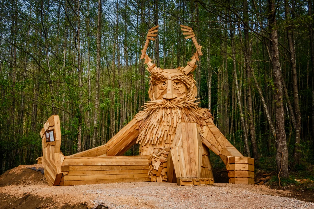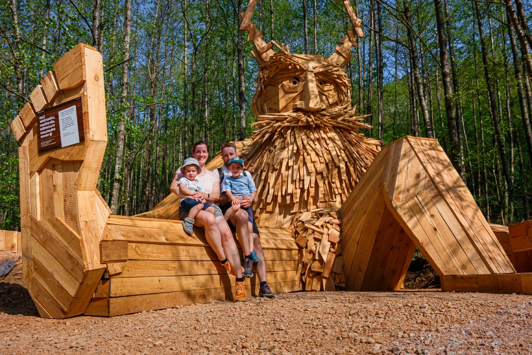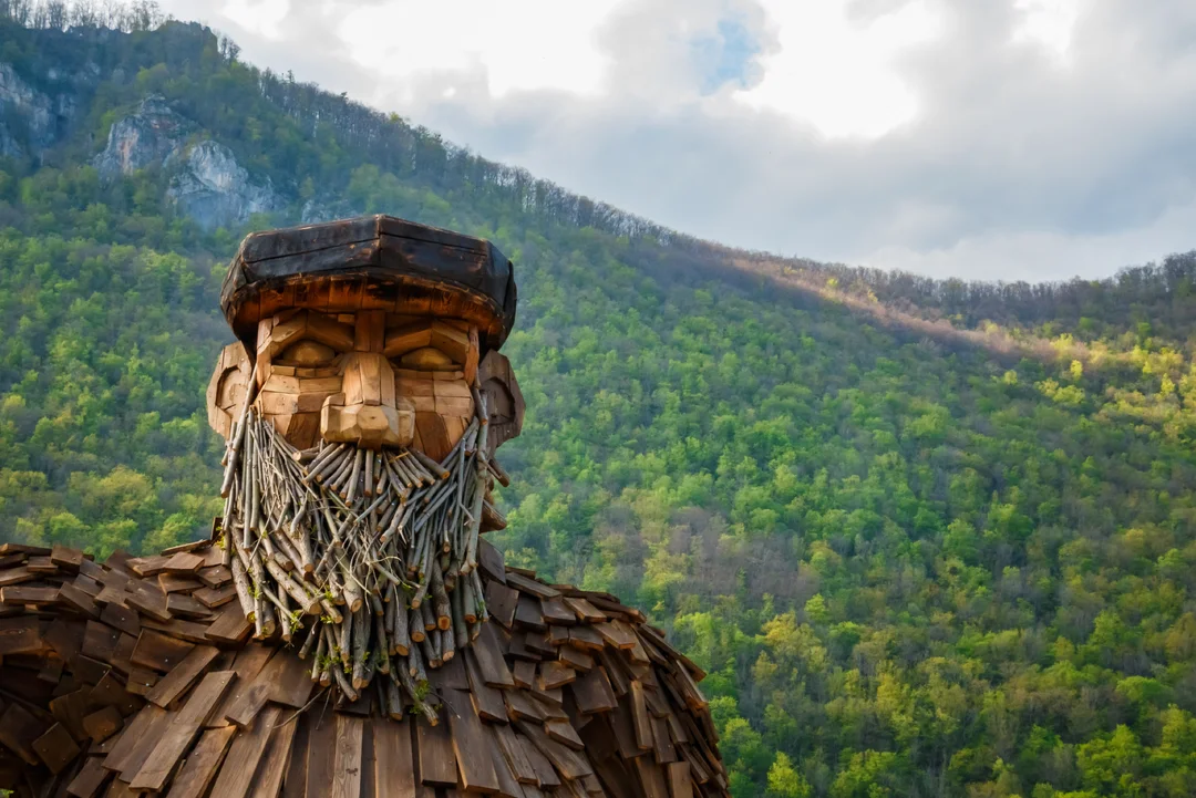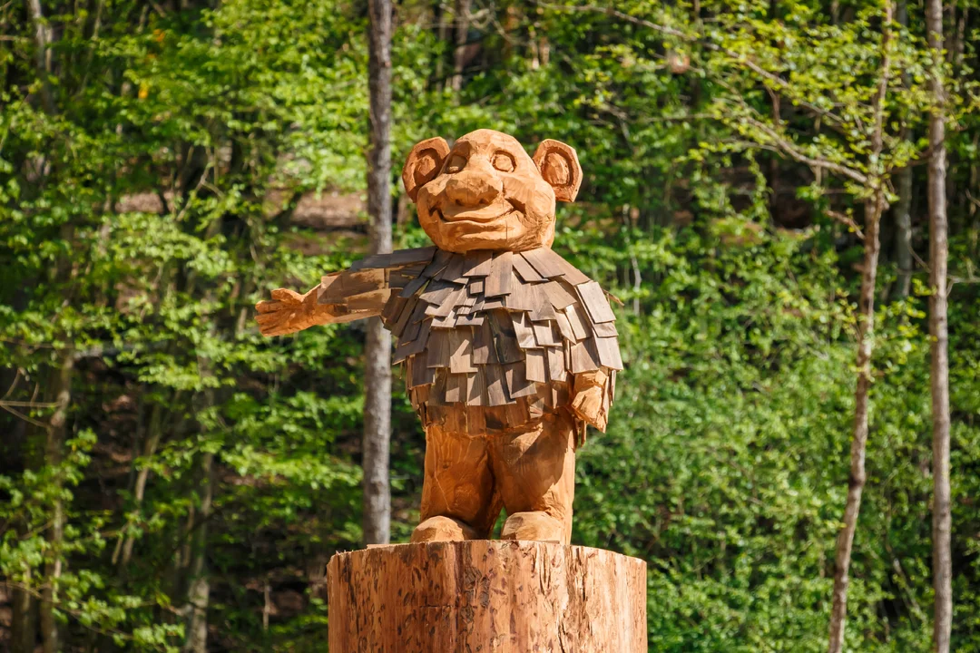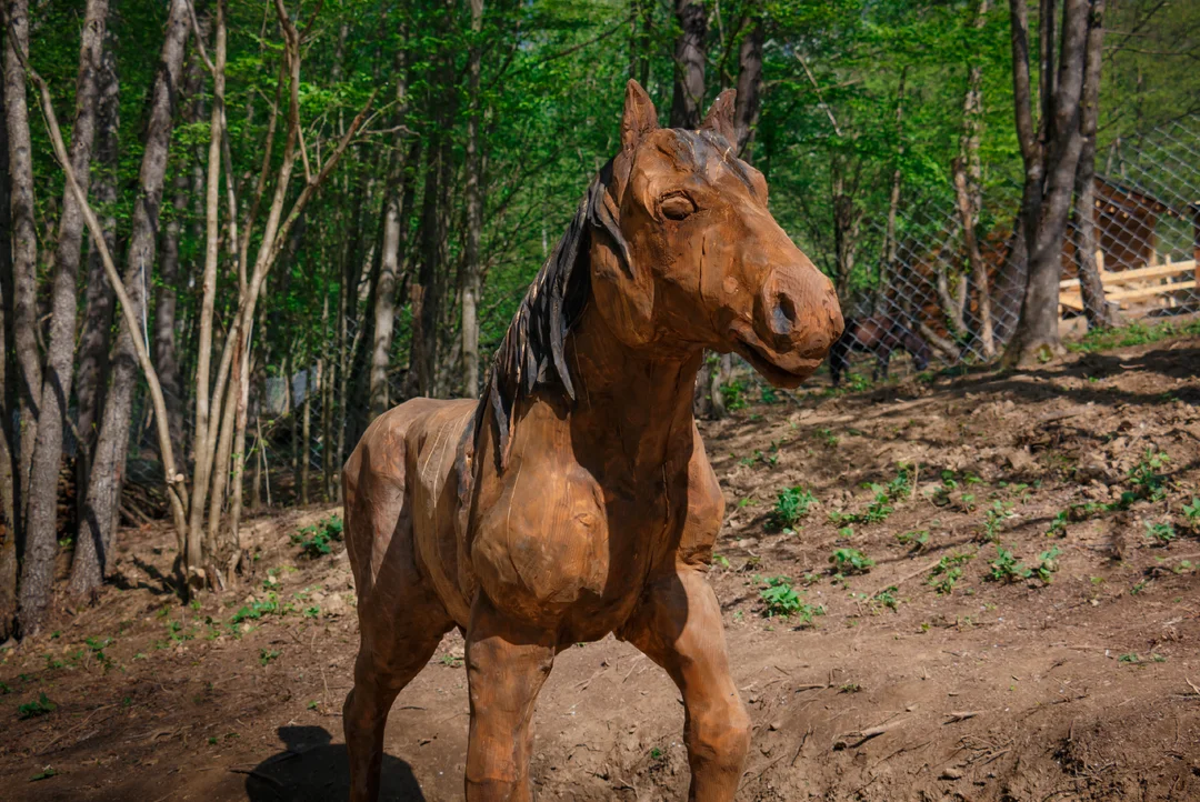 Obrovské sochy vo výške 7 až 9 metrov vyrobili majstri rezbári z Česka, niektoré vážia až 5 ton. Nájdete tu obrov menom Leši, Machoš, Bažur, obriu sovu Széchy a ďalších drevených sympaťákov. Inšpiráciou pre vznik parku bola najmä tajuplná slovanská mytológia a tiež vedecko-fantastická kniha miestneho rodáka Gustáva Reussa Hviezdoveda.
