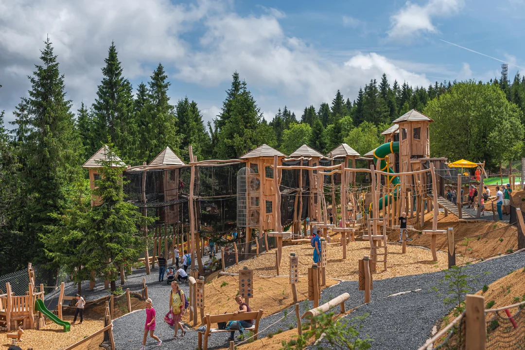 Obrovské baranidlo, viacúrovňový lanový park, Pokuston či megatrampolína je len pár z vyše dvadsiatky rôznych prvkov, ktoré si môžete vyskúšať na ploche takmer 5000 m². Celé ihrisko vyrástlo na horskej lúke a uprostred lesa. Jeho súčasťou je aj hravá edukácia a interaktívne spoznávanie prírody. Kým sa deti vybláznia, rodičia si môžu posedieť na lavičkách a kochať sa výhľadmi na okolitú prírodu.