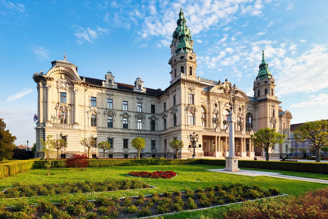 Impozantná dvojposchodová budova je postavená v eklektickom štýle v tvare písmena U. Zrak návštevníkov púta najmä monumentálna 59 metrov vysoká centrálna veža, dve menšie veže a neprehliadnuteľný balkón nad hlavným vstupom. Z jej veže znie každú hodinu pieseň „Fújdogál a szél az öreg Duna felől“ (Pofukuje vietor od starého Dunaja). Radnica bola postavená v r. 1896–1898 podľa plánov architekta Jenő Hübnera a nahradila pôvodnú radnicu, ktorá bola pre potreby rozvíjajúceho sa mesta primalá.
