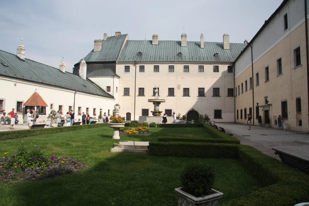 Po mostíku sa dostanete do vnútorného nádvoria, kde si môžete posedieť pri kávičke a deti si hneď osedlajú miestnych levíkov.